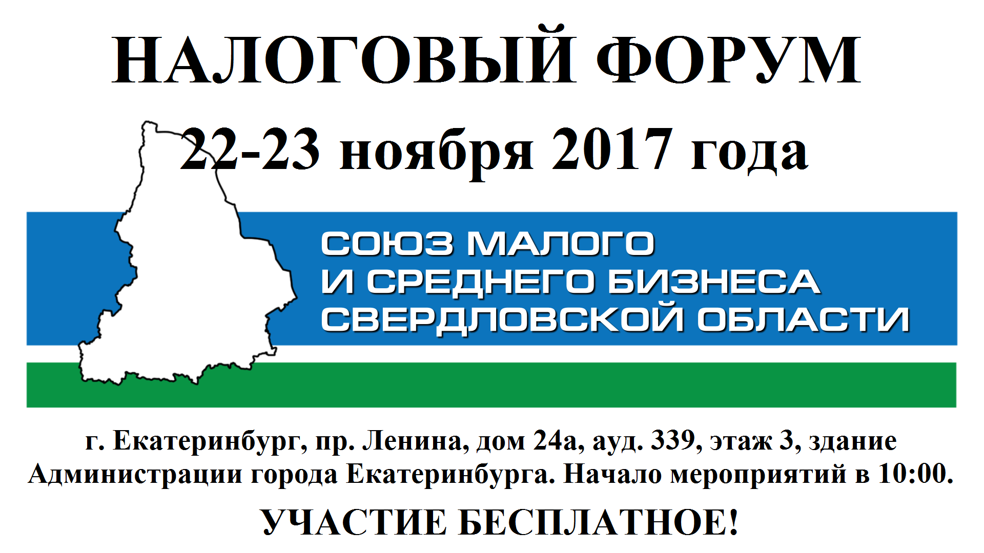 Администрация г. Екатеринбурга совместно с Союзом малого и среднего бизнеса Свердловского области, Управлением налоговой службы по Свердловской области и Общественным советом при Управлении 22-23 ноября 2017 года проводят двухдневный налоговый форум «Создание комфортных условий для исполнения налогоплательщиками налоговых обязанностей. Развитие открытого диалога бизнеса и налоговых органов».